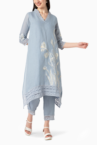 Become the walking canvas in luxurious linen. A V-neck Kurta featuring delicate lace accents and Inspired by oil paintings, the Tulip Painting range is exquisitely handcrafted with abstract motifs of the beloved tulip- hand screen printed with elegant thin lines of heat-pressed craft to the fabric and finished with delicate lace details culminating in a glorious homage to the bloom of love.