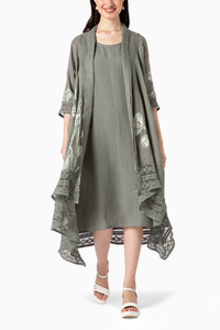 Become the walking canvas in luxurious linen. A free flowing jacket paired with a fitted dress with 3/4th sleeves and Inspired by oil paintings, the Tulip Painting range is exquisitely handcrafted with abstract motifs of the beloved tulip- hand screen printed with elegant thin lines of heat-pressed craft to the fabric and finished with delicate lace details culminating in a glorious homage to the bloom of love.
