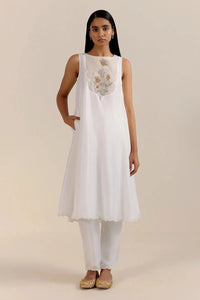 The Jaigarh Kurta exquisitely crafted in buttery soft silk and decorated with beautiful handwoven Mughal Tulip Motifs finished with zardozi hand embroidery in the yoke. The hemline is finished pearls on our signature handcut scallops. The kurta comes with silk pants.