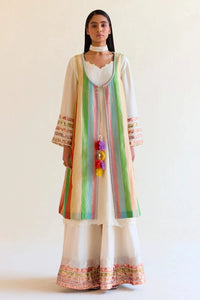 A vibrant expression of craft, the Jaipur Saptranga Tissue Choga is handwoven in seven colours of silk and gold zari by our artisans in Banaras. Paired with a sleeveless silk kurta featuring hand-scalloped detailing and a sharara adorned with Kimkhwaab Tanchoi and Saptranga tissue borders, it embodies regal elegance.
