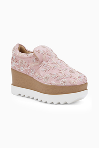 Our Jam St. wedge sneakers are designed to feature at the top of your favourite’s list of all things sweet. They are crafted in satin and embellished with resham thread embroidery, mini pearls, and cutdana work. Covered in soft florals all over, this is the perfect pair for your next elegant ensemble. It comes in our unique silhouette, a combination of wedges and sneakers. Anaar loves indulging in glamour without giving up on comfort and ease. This shoe hits that sweet spot!