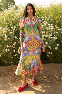 Featuring the Jamaica Multi-Color Dress by DeCastro Moda, this striking dress features a straight silhouette, puff gathered sleeves, and a Nehru collar with a stylish lace-up décolleté for a bold, modern look.