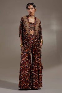 Featuring the Jamuni Anka Blouse and Sharara Pants with Veni Dupatta Jacket Set by Aseem Kapoor’s ANKA collection. This co-ord set pairs a fully embroidered blouse and printed sharara pants with an anti-fit jacket, adorned with resham embroidery, M.O.P. beads, and tassels.