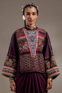 Featuring the Jamuni Anka Koji Big Jacket by Aseem Kapoor’s ANKA collection. This loose, boxy structured jacket showcases resham thread embroidery, Mother of Pearl accents, and bead tassel details for a bold, artistic statement.