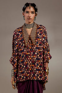 Featuring the Jamuni Anka Mandala Shirt by Aseem Kapoor’s ANKA collection. A polka print, free-size shirt with an embroidered long collar, designed with no armhole and an anti-fit silhouette for effortless, easy wear across all sizes.