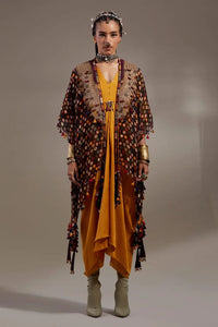 Featuring the Jamuni Anka Veni Dupatta Jacket by Aseem Kapoor’s ANKA collection. This free-sized, anti-fit jacket features resham embroidery, beads, and tribal tassel details, designed without armholes for a unique, embroidered printed look.