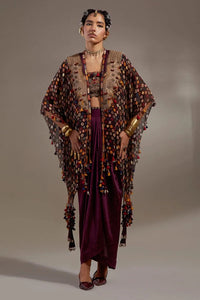 Featuring the Jamuni Anka Veni Dupatta Jacket Festive Set by Aseem Kapoor’s ANKA collection. An embroidered and printed jacket with tribal tassel details layered over a solid textured drape dress, embellished with resham thread, beads, and tassels for a relaxed, festive look.