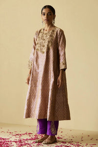 The Jamuni Golconda Kurta is crafted from handwoven silk brocade with gold-plated zari and detailed floral embroidery in dabka and zardozi. Paired with the pure silk Jamuni Chiran Pyjama, featuring hand-embroidered paisley bootas in nakshi and aari, this ensemble reflects timeless elegance and exquisite Banarasi craftsmanship.