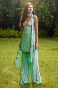 Featuring the Janeman Aqua Short Kurta by Nikasha’s Dilruba Collection, this aqua silk crepe strap kurta showcases Chotu Sanga prints with delicate embroidery. Paired with coordinated bell-bottom pants and a Badal Bibi printed skinny scarf, this look blends charm with contemporary flair.