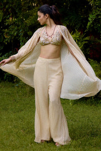 Featuring the Janeman Cream Co-ord Set by Nikasha's Dilruba Collection, a striking blend of tradition and modern flair. The look includes a Chotu Sanga printed bralette adorned with intricate hand-embroidered sequins, layered with a sheer georgette overgarment finished with tassel accents, and paired with elegant silk crepe bell-bottoms.