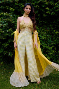 Featuring the Janeman Cream Jumpsuit by Nikasha’s Dilruba Collection, this cream silk crepe jumpsuit showcases Chotu Sanga prints with intricate heavy embroidery and tassel accents. It is paired with a bright yellow georgette embroidered overgarment, creating a vibrant, layered ensemble.