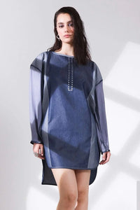 Crafted from contrasting denim washes, this longline tunic features a relaxed silhouette with dropped shoulders and full-length sleeves for effortless movement. The back is adorned with a vertical stitch detail, adding a subtle yet refined touch. Designed with a high-low hem for versatility, this piece can be styled as a dress or layered over trousers for a contemporary, urban-chic look.