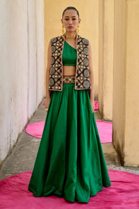 Fabric- Top: Silk, Skirt: Silk, Jacket: Silk Color- Emerald Length- Top: 14", Skirt: 44", Jacket: 24" Details- Hand Embroidery Components- 3 Product Code- SVESWATSVJ 5006