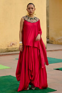 Fabric- Top: Modal, Skirt: Modal Color- Fuchsia Length- Top: (28" front) (43" back), Skirt: 43" Details- Hand Embroidery Components- 2 Product Code- SVESWATSVJ 4074