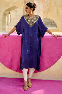 Featuring the Purple Chameli Kaftan Set from Swati Vijaivargie’s Jantar Mantar Collection. A resplendent tribute to Jaipur’s rich heritage. Crafted in luxurious modal silk in a striking purple and ivory palette, this elegant set is adorned with intricate hand embroidery. Paired with matching pants designed for comfort, featuring a front belt and back elastic.