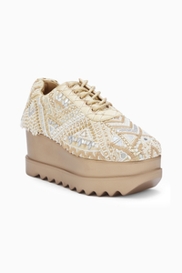 Meet Anaar’s chosen style for the big fat Indian celebration. Twirl under marigold chandeliers, dance to your favourite Bollywood tunes, savour famous street eats and sweetmeats, and fill your bag of souvenirs with plenty of memories — but do it all wearing our Jashn wedge sneakers. They’re extravagant, joyous and made with all our love. Crafted in satin, each pair is skilfully embellished with mirror work, gota patti, sequins, and