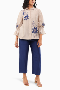 This elegant co-ord set is crafted from luxurious Chanderi silk, offering a blend of tradition and modernity. The shirt features intricate Resham thread embroidery and 3D appliqué work of wild floral motifs, adding depth and texture, while the contrast pants complete the look with effortless sophistication. Perfect for the conscious woman who values both style and sustainability.