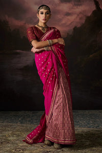 Featuring the Jasmine Maroon Pink Sari Set by Swatti Kapoor's Firdaus collection. This graceful two-piece ensemble includes a handwoven Muga silk brocade blouse and a Banarasi Chanderi sari in mauve and rani pink, adorned with intricate hand embroidery.