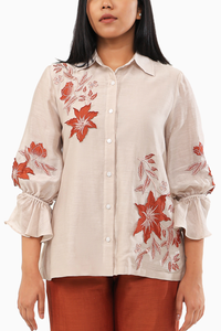 Crafted from luxurious Chanderi silk, this off-white shirt is adorned with delicate Resham thread embroidery and intricate 3D appliqué work of wild floral motifs. The blend of traditional artistry and contemporary design makes it a standout piece for any wardrobe, offering both elegance and sophistication.