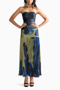 Featuring Jennifer Green Dress by Saaksha & Kinni from Botanica Collection. Embrace elegance with daisy print hand micro pleat sleeveless gown. Adorning a fitted bodice and flowing pleats, this dress blends sophistication with a touch of floral charm.