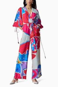 Featuring Jenny Ikat Overlap Jumpsuit by Saaksha & Kinni, this stylish jumpsuit showcases an Ikat-inspired print with an overlap design, detachable belt, and hand-embroidered sleeve tie-ups for a chic, modern look. Perfect for a bold, contemporary statement.