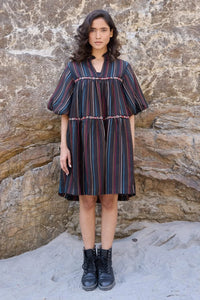 The Jess Black Dress features a charming tiered striped design, accented with delicate hand-embroidered floral vines. This effortless dress combines a playful silhouette with intricate detailing, making it a perfect blend of casual elegance and artistic flair.
