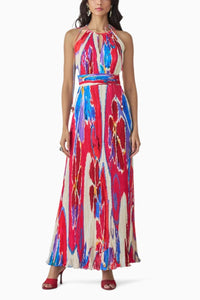 Jewel Ikat Pleat Halter Neck Maxi Dress