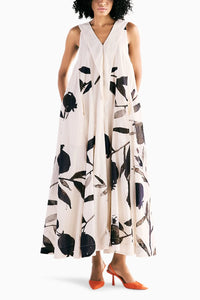 This classic off-white floral art printed jumpsuit features a front zip opening and a flattering V neckline, designed with side pleats for added elegance. Crafted from soft cotton mul, it offers both comfort and style. The jumpsuit is fully lined for a smooth and comfortable fit and includes side seam pockets for practicality, making it a perfect blend of chic design and functionality.