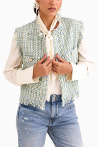 Stylish sleeveless jacket with functional outerwear piece designed without sleeves, fringe detailing, offering a versatile layering option. Typically tailored for a sleek fit. Perfect for layering over shirts, turtlenecks, or dresses, a sleeveless jacket provides warmth and style without restricting movement.