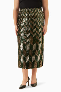 Multicolour sequined jewel tone skirt in emerald green, copper and silver placed in broken chevron pattern on black mesh. Lined with a black knitted fabric. Knee-high slit on both sides. Hook and zip closure on the wearer's left. Elasticated at the waist.