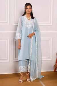Featuring premium Cotton Chanderi for a luxurious feel, this ensemble is adorned with intricate dori work and embroidery on the neckline, sleeve cuffs, and pant edges. The flattering V-neckline and 3/4th sleeves with detailed embroidery add elegance, while the dupatta with scalloped border embroidery completes the refined finish.
