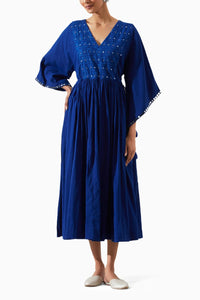 Featuring Jhumka Dress by Label Earthern from their Band Phool Collection. This royal blue cotton mal dress is adorned with intricate resham work and mirror detailing, offering a vibrant and sophisticated look.