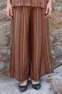 The Jo Striper Brown Trouser features a bold striped pattern with a wide hem, offering a modern and stylish silhouette. Perfect for adding a touch of sophistication and flair to any outfit.