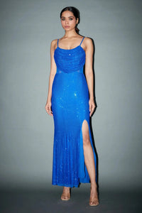 Featuring the Joanna Blue Dress by ITRH's Diwali Jaaneman Collection, this royal blue gown is designed with a crystal-embellished cowl corset and a striking slit, blending contemporary glamour with timeless elegance for a bold and sophisticated look.