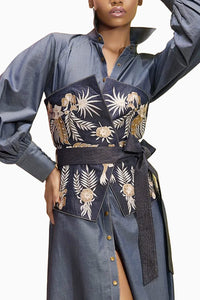 A chic corset with boho-inspired extensive embroidery on the front bodice. The corset can be teamed with a shirt, dress or on its own to suit the mood and time of the day. Elevate your look with the waist belt tied into a pretty bow.