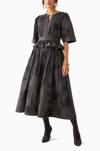 The Joy dress in Blocks print features a rounded neckline paired with a deep V placket. Intricate pintuck details and contrasting topstitching add a touch of artisanal craftsmanship, enhancing its unique design. Slightly puffed sleeves and the cinched waist create a defined shape. The voluminous skirt adds a playful, dramatic flair