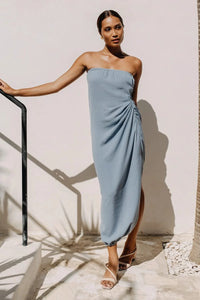 Crafted from luxurious Acqua Blue Textured Crepe, this fitted design features elegant hand draping that accentuates the silhouette, offering both sophistication and style
