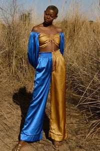 Contrasting colors come together to create a striking combination in the Joyce Co-ord Set. The top features a cinched waistline and balloon sleeves, while the bottom showcases the same dual-tone on opposite sides.