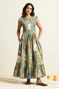 A unique hand rendered print, adding a touch of nostalgia and uniqueness to your wardrobe. The elasticated smocking offers a comfortable and relaxed fit, while the maxi style adds elegance. Perfect for a special occasion or everyday wear