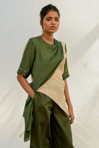 Drape detail top in green and beige. Effortless, stylish and comfortable.