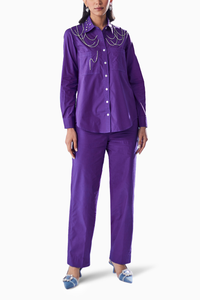 Featuring the Juno Co-ord Set from House of Zeniaa's Mamma Mia Collection, a stylish and elegant ensemble in purple cotton that's sure to make a statement. Adorned with rhinestone laces and an embellished collar, it adds sparkle and sophistication to the design. With full sleeves for coverage, it's versatile for any season. Pairing it with the same pants creates a coordinated and polished look perfect for both casual and formal occasions.