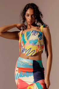 A digitally printed corset with touches of hand embroidery all over. The Juno Embroidered Corset comprises of straps that can be tied at the shoulder and a zip at the back for closure.
