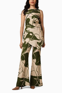 A draped top with a contrast piping at the bodice and an asymmetrical hem paired with flared trousers of the same print.