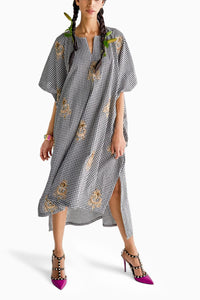 Introducing a chic and comfortable kaftan-style kurta adorned with exquisite embroidery detail. This loose-fitting garment offers a relaxed silhouette, perfect for lounging at home or enjoying a leisurely day out.