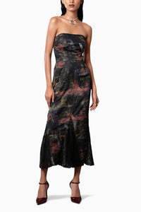 The Kagé Tube Dress is a strapless, fitted midi dress that offers a sleek, flattering silhouette. Pleated godets around the hem create a striking contrast, adding movement and style to this chic and modern design. Perfect for a bold, fashion-forward look.