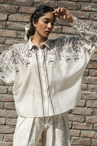 This classic shirt features printed dolman sleeves and high-end tailoring, creating a shape that exudes subtle simplicity. The sharp-edge collar, front placket with pin tucks, and tape detailing offer a refined touch for women who appreciate everyday luxuries. With its slightly oversized silhouette, its perfect for both a casual office day or a lively office setting. Finished with hand-screen print, pin tuck detailing, tape along the shoulder, sleeve, and back, and MOP buttons, this shirt effortlessly combines elegance and ease.