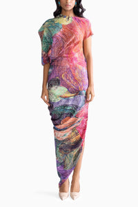 Featuring Kai Multi Dress by Saaksha & Kinni from Botanica Collection. A daisy print kaftan-style dress with a draped skirt, blending floral charm with elegant flow for a relaxed yet sophisticated look.