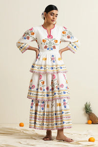 This beautiful dress features hand-rendered floral prints on a fitted, tiered design. The perfect combination of style and femininity, our maxi dress is sure to make a statement. The dress is fully lined and has a side zipper.