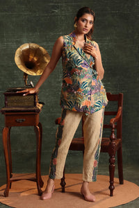 The Multicolor Kaira Printed Sleeveless Blazer Top is a bold and stylish piece, featuring a vibrant print that adds a modern flair to a classic silhouette. The sleeveless design and tailored fit create a sleek, contemporary look, while the bold colors make a statement. Paired with comfortable cotton pants, this ensemble offers a perfect blend of sophistication and ease.