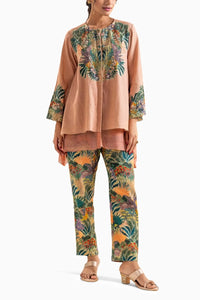 The Pink Kaira embroidered layered top showcases intricate embroidery with a stylish layered design, adding a touch of elegance and depth. Paired with printed cotton pants, this ensemble offers a comfortable yet chic look, perfect for casual or semi-formal occasions. The combination of traditional craftsmanship and modern style makes it a versatile choice.